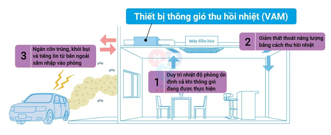 Tiết kiệm năng lượng: Thiết bị VAM trao đổi nhiệt giữa luồng khí thải ra và khí tươi đi vào, giúp giảm tải nhiệt đáng kể cho hệ thống điều hòa chính, từ đó giảm chi phí tiền điện hằng tháng.