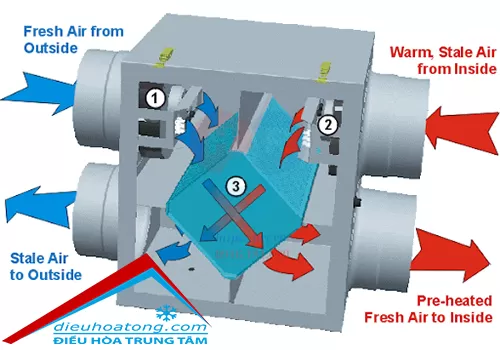Khi hệ thống vận hành vào mùa hè, không khí tươi từ ngoài trời thường có nhiệt độ rất cao (ví dụ 35°C). Trong khi đó, không khí thải từ trong phòng điều hòa có nhiệt độ thấp (khoảng 25°C). Khi đi qua bộ trao đổi nhiệt, luồng khí thải sẽ hấp thụ bớt nhiệt lượng từ khí tươi. Kết quả là khí tươi đi vào phòng chỉ còn khoảng 27°C đến 28°C, giúp giảm tải đáng kể cho máy nén của hệ thống điều hòa trung tâm.